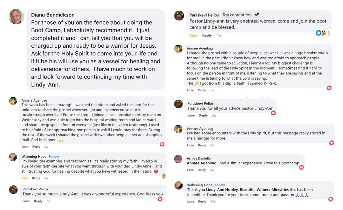 Goal : Watch the clip and work through the guidebook with Jesus daily as much as possible. This Beautiful Witness 30-Day Bootcamp runs for an entire month. Lindy-Ann Hopley will give you short power-packed daily video teaching of her best tools, PLUS on Mondays at 12pm, you'll have an opportunity to ASK QUESTIONS and Lindy-Ann WILL ANSWER. She will be doing PRAYER & Q&A on the Exclusive Bootcamp Facebook Group to answer those questions that may have arise from the teachings on a WEEKLY BASIS.